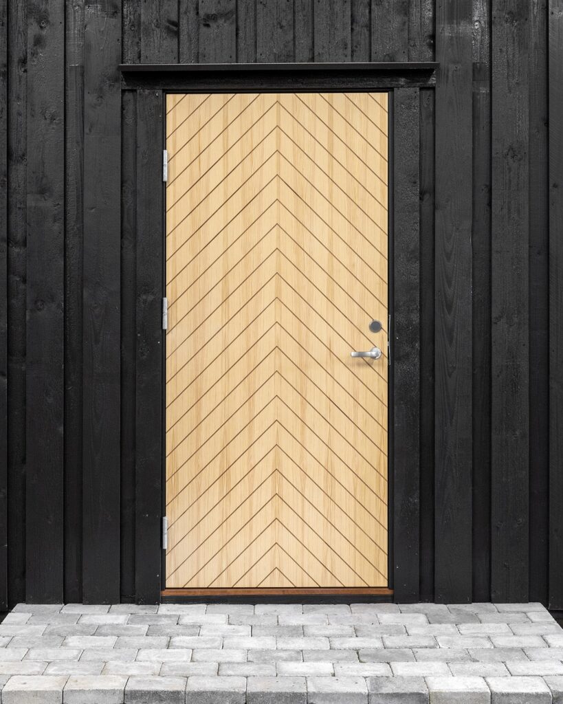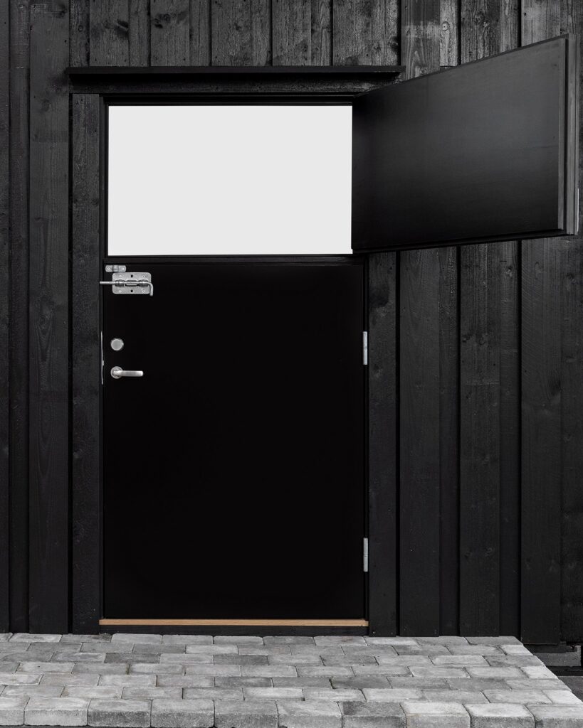 Se utvalgte stalldører, landbruksdør (en- og tofløyet dør, panelspor eller fiskeben mønster) med eik- eller rustfri dørterskel.